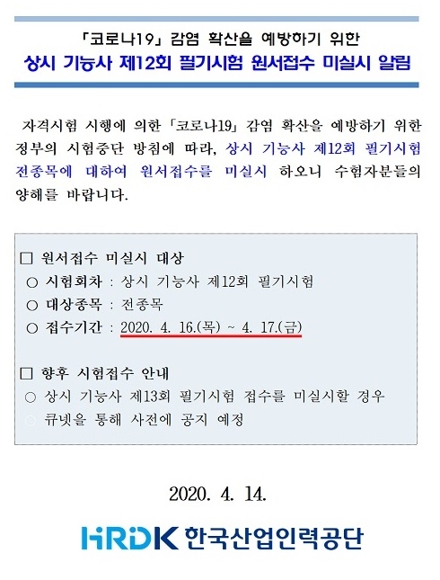 ----------- 2020³â »ó½Ã ±â´É»ç Á¦12ȸ Çʱâ½ÃÇè ¿ø¼­Á¢¼ö ¹Ì½Ç½Ã ¾Ë¸² ----------- ¿î¿µÀÚ 2020-04-15 636