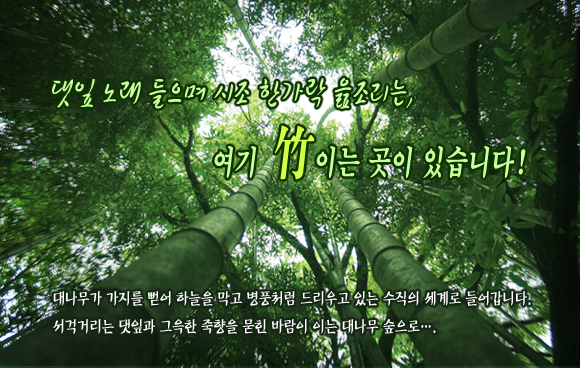 ¸ÞŸ¼¼ÄõÀ̾ƿ¡ ÃëÇØ ´ë½£¿¡ µì´Ï´Ù. ¶¥³¡±îÁö ±æ°Ô »Ñ¸®¸¦ ³»¸®°í, ÇÏ´Ã ³¡À» °üÅëÇÏ´Â µí »ª»ªÇÏ°Ô Âß »¸¾î ³»¸° ´ë³ª¹« ½£ÀÎ ¡®´ë³ª¹«°ñ Å׸¶°ø¿ø¡¯ ÀÔ´Ï´Ù. ¿ö³« »ª»ªÇÑ ´ë½£ÀÌ¶ó º¸Åë µé¾î°¡±â´Â ÈûµéÁö¸¸, ÀÌ °÷Àº ÀϹÝÀεéÀÌ ÃâÀÔÇϱ⠽±°Ô °ø¿øÀ¸·Î Á¶¼ºµÇ¾ú½À´Ï´Ù. ´ë³ª¹« ½£À¸·Î µé¾î°¡´Â ±æÀº ¼öÁ÷ÀÇ ¼¼°è ÀÔ´Ï´Ù. 20m ÀÌ»ó ³ôÀÌÀÇ ±½Àº ´ë½£¿¡ µé¾î¼ ÀÖ´Â ½£¿¡ µé¾î¼¸é ÀÚ½ÅÀÌ ÇѾøÀÌ ³·¾ÆÁüÀ» ´À³§´Ï´Ù. ¿Â ¸öÀ» °¨½Î´Â Á×Çâ ¾Õ¿¡¼± °ªºñ½Î°Ô ÁÖ°í »ê ¸íǰ Çâ¼öÀÇ Çâ±âµµ ±Ý¼¼ »ç±×¶óÁ®¹ö¸³´Ï´Ù. ´ë½£ »çÀÌ·Î ºÒ¾î µé¾î¿À´Â ¹Ù¶÷°áÀ» ´À³¢¸ç °É¾îº¾´Ï´Ù.